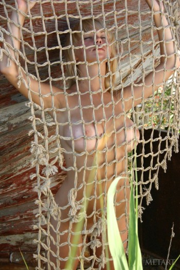 Cute blonde is naked out in the farm on some wood boards. She is always wearing her bikini when she is at the beach, so she has some nice white tan lines.