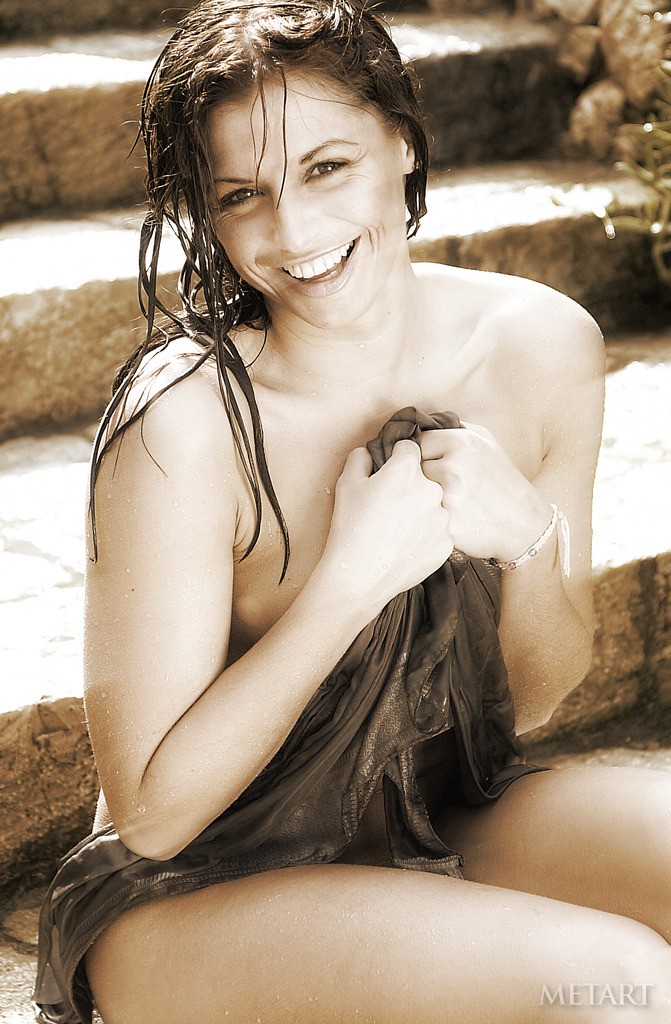 Stunning girl reveals her tight little ass with those small natural titties while completely soaked after a quick swim in her transparent towel.