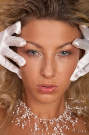 Glam lady poses half-naked on camera. She covers her stunning body with stockings, gloves and corset before spreading her long slim legs.