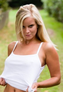 Busty blonde goes for a walk to pose totally naked on camera. Hottie takes off her sexy outfit and plays with her round bottom, as well as wet pussy.