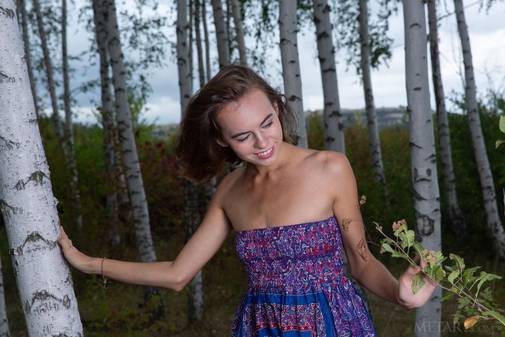 Slim cutie goes for a walk in the forest where she performs a striptease, takes seductive positions and even shows the beauty of her clean shaved pussy