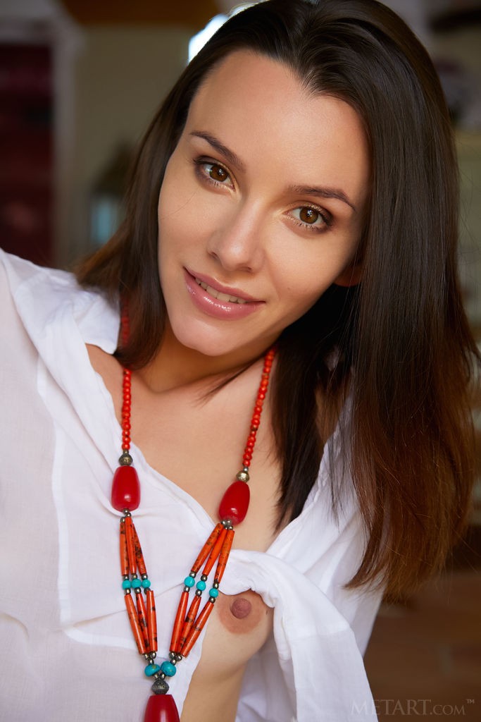Yummy cutie in white shirt sits down on the floor to show her tanned body with clean shaved pussy, small natural tits, firm butt and flat tummy