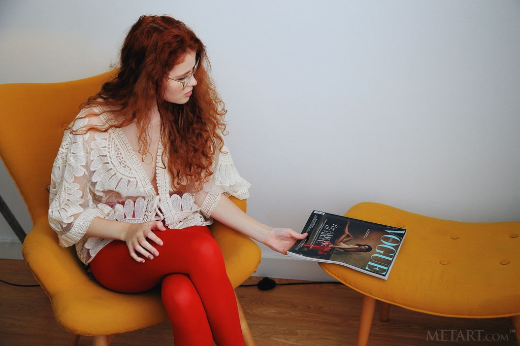Ginger babe explores her sweet pussy in armchair