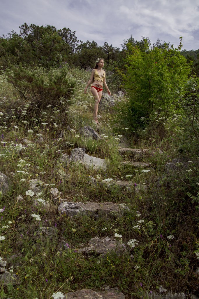Gentle cutie lies down on her back in the meadows to caress every inch of her hot smoking body with summer flowers, as well as her hands
