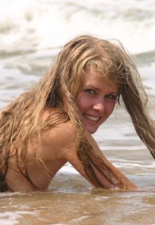 When hitting the beach to play in the water, this scalding hot blonde wears nothing but a pearl necklace as she gets naked, wild, and wet.
