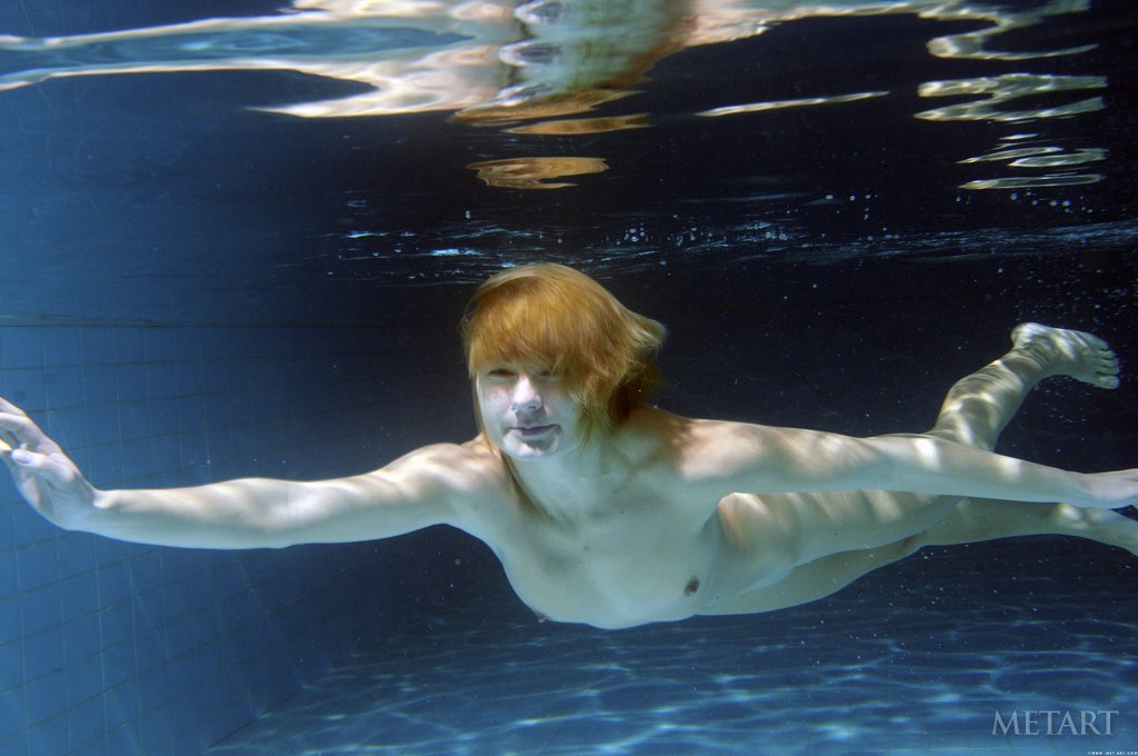 There is a camera under the water and it is recording the fine ginger babe as she is taking a dip in the cool water. Her body is standing at attention while shots are getting snapped.