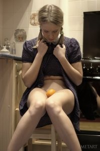 Tall blonde woman is sitting on her chair in the kitchen and she is looking at an orange. She thinks of ways to play with that piece of fruit and then she lifts up her dress.